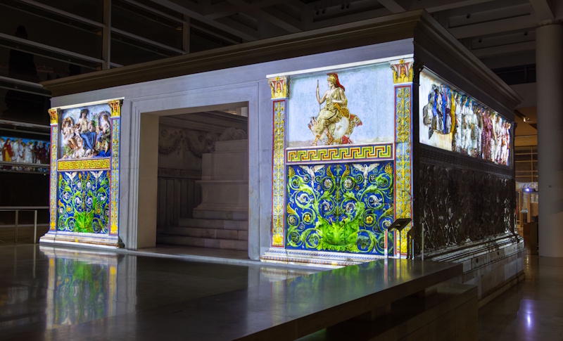 Sull’ipotesi della colorazione originaria dell’Ara Pacis ha lavorato negli anni passati un gruppo di studio nato in occasione dell’allestimento del nuovo Museo. In particolare, è stato approntato un modello tridimensionale dell’altare sul quale è stata applicata la restituzione del colore secondo criteri filologici e storico-stilistici. Dal modello è nata l’idea di proiettare direttamente sulle superfici in marmo dell’altare raggi di luce colorata per ricreare, in via d’ipotesi, l’aspetto totale e realistico prossimo alla policromia originaria.